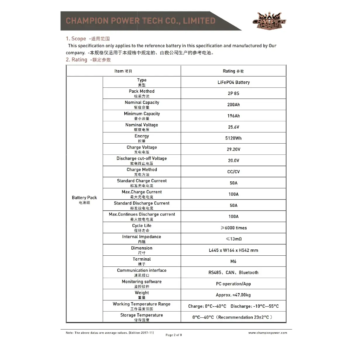 — **Тип батареї**: CHAMPIONPOWER LFP25.6-200